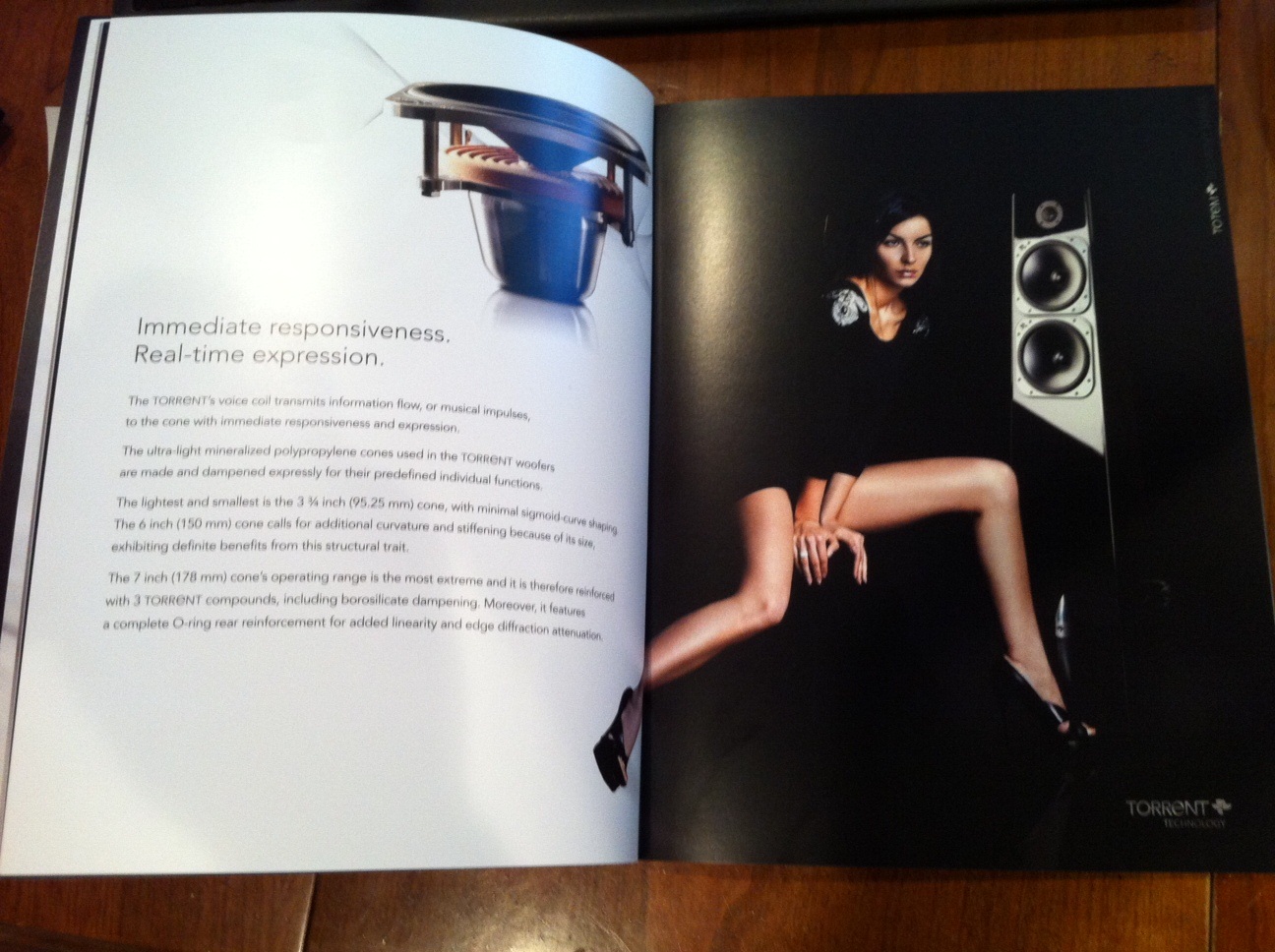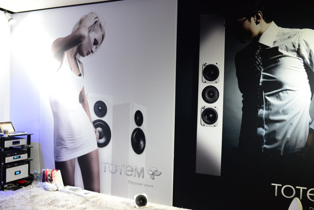I give full credit to Totem for their impressive full sized wall-to-wall marketing posters, which also serve as acoustic room treatments supposedly. How could you not be distracted from the music when there is a wall sized model standing right in front of you dressed in a mini-skirt.