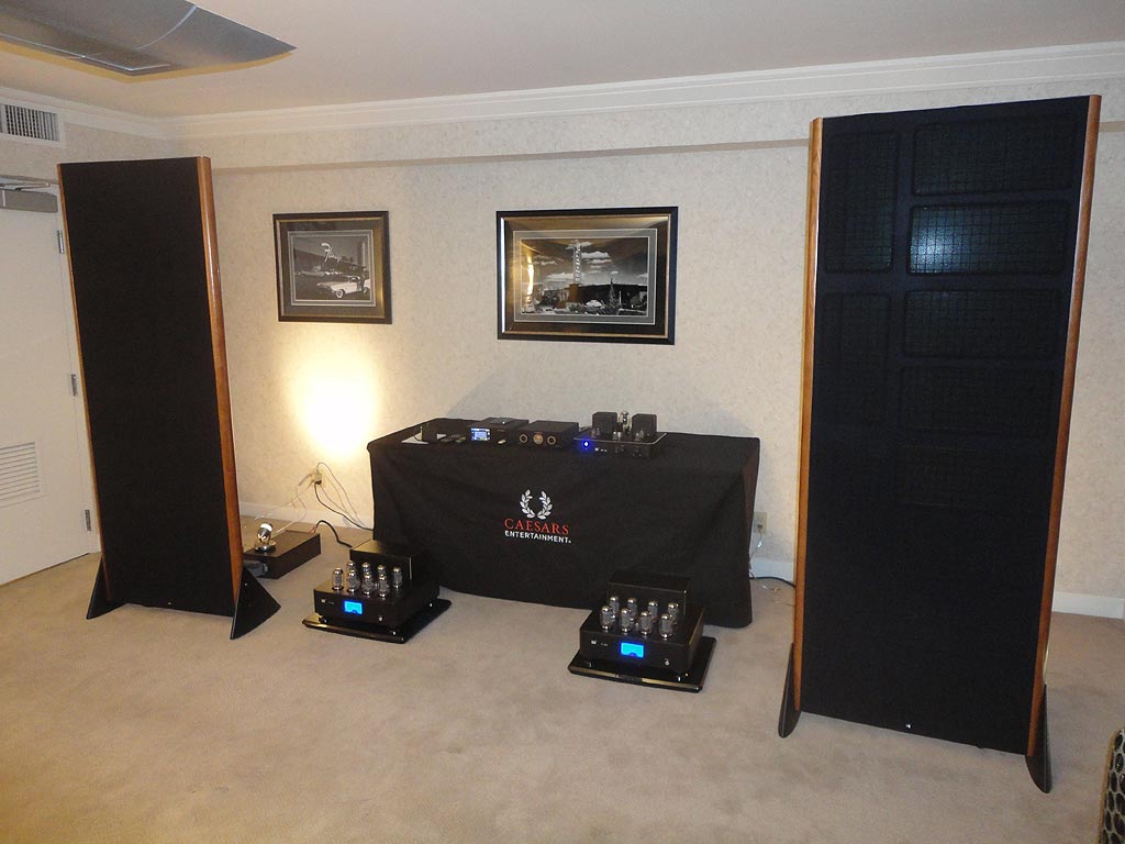 It doesn’t get much faster in terms of listening than an electrostatic speaker. At CES, King’s Audio, the Hong Kong manufacturer of Kingsound products, showed the vaunted KS-10 ($30K), the three-way version of the King III ($12K) which I own and reviewed. New on the scene were complementary electronics; the PP-10 ($4K) Tube Preamplifier and P-100 Tube Amplifier ($6K). The P-100 clocks in at 120wpc, while the smaller P-80 ($4K) is at 100wpc. The KS-10 was reminiscent of the larger Sound Lab speakers, and it had a preternatural ease and spaciousness. Making use of a corner of their space a table displayed the surprisingly good sounding Emperor headphones and tube preamplifier ($3K).