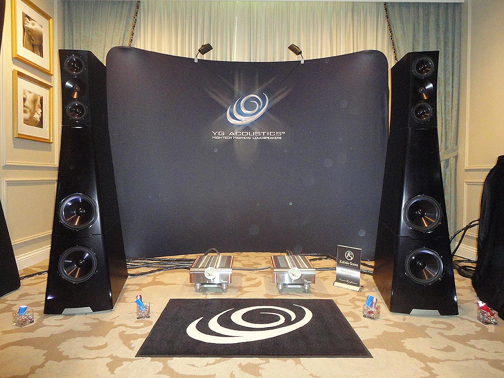 One of the most bewildering moments of either show happened when I sat down in front of the YG Acoustics Sonja 1.3 Speakers ($106,800). The system was comprised of Scheu Analog Das Laufwerk 1 Turntable ($8,330), 12 Tacco Tonearm ($4,995) and Ruby 3 Cartridge ($2,950) for vinyl, and Aurender Digital Music Server ($6,990) feeding dCS Scarlatti System 4-box ($80k) for digital. Veloce Audio LS-1 Linestage Preamplifier ($18K) and D’Agostino Momentum Monoblock Amplifiers ($55K/pr) were linked via a loom of Kubala-Sosna Elation! Cables ($85K).