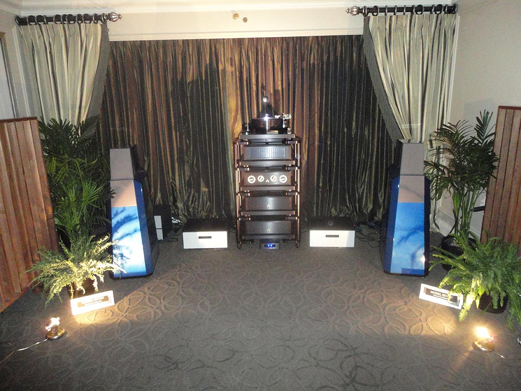 I had a nice chat with Richard Vandersteen as we discussed the evolution of his show systems. He seemed pleased with the direction his rooms had taken over the past few years, noting that room treatment and setup seems to be the most neglected element of show systems. Indeed, few were as carefully laid out as that highlighting the Model 7 ($48K+), which characteristically was full bodied, easeful and richly textured as it was coupled with Ayre electronics. The Aesthetix Io Eclipse Phono Stage with outboard power supply (15.5K) with a Brinkman Balance table and Triplanar arm with Lyra Atlas Cartridge played into the Ayre Calysto Eclipse Line Stage ($17K) with optional volume control ($2.5K) and the Atlas Mono Amps ($16K/pr). An intriguing new liquid cooled amplifier, the M7-HPA, for “High Pass Amplifier,” complete with fully balanced “floating” (i.e. physically isolated internally on movement absorbing cushions) circuitry, is designed to drive the top end of the Model 7 Speaker; price will be upwards of $30K.