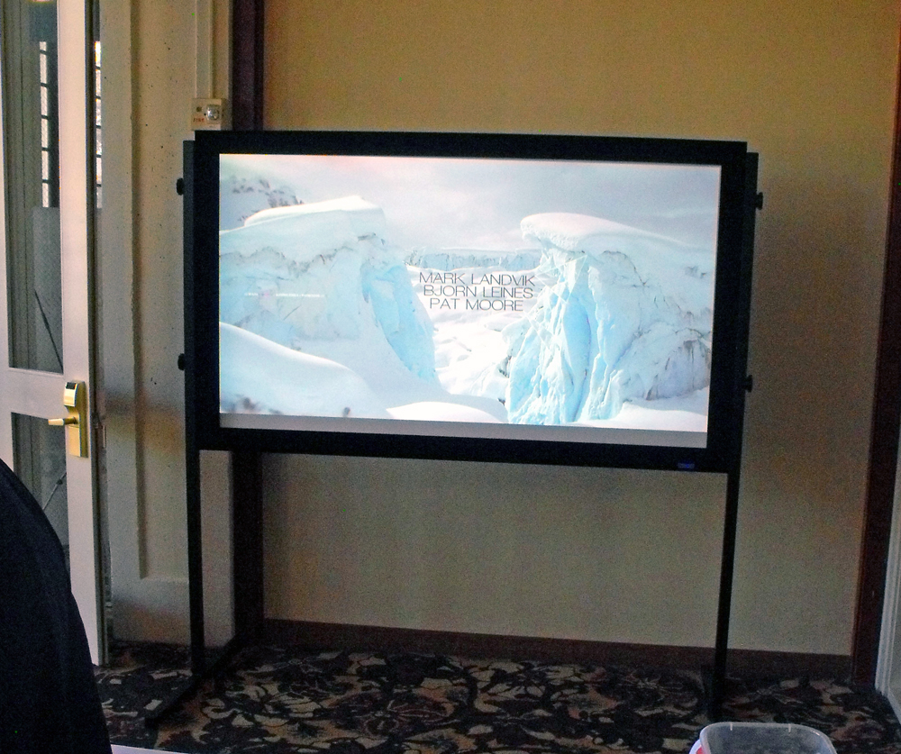 Steven Lester (Sim’s local Rep) showed a beautiful white glass SIM2 Nero 3 pure LED (at $14,000, one of their more popular models) with a generic folding screen. He promised a new screen vendor for next year for a better look. On static display was SIM2 Lumens 20th Anniversary and Super Cube in blue glass. The picture was clear and crisp with very good color balance.