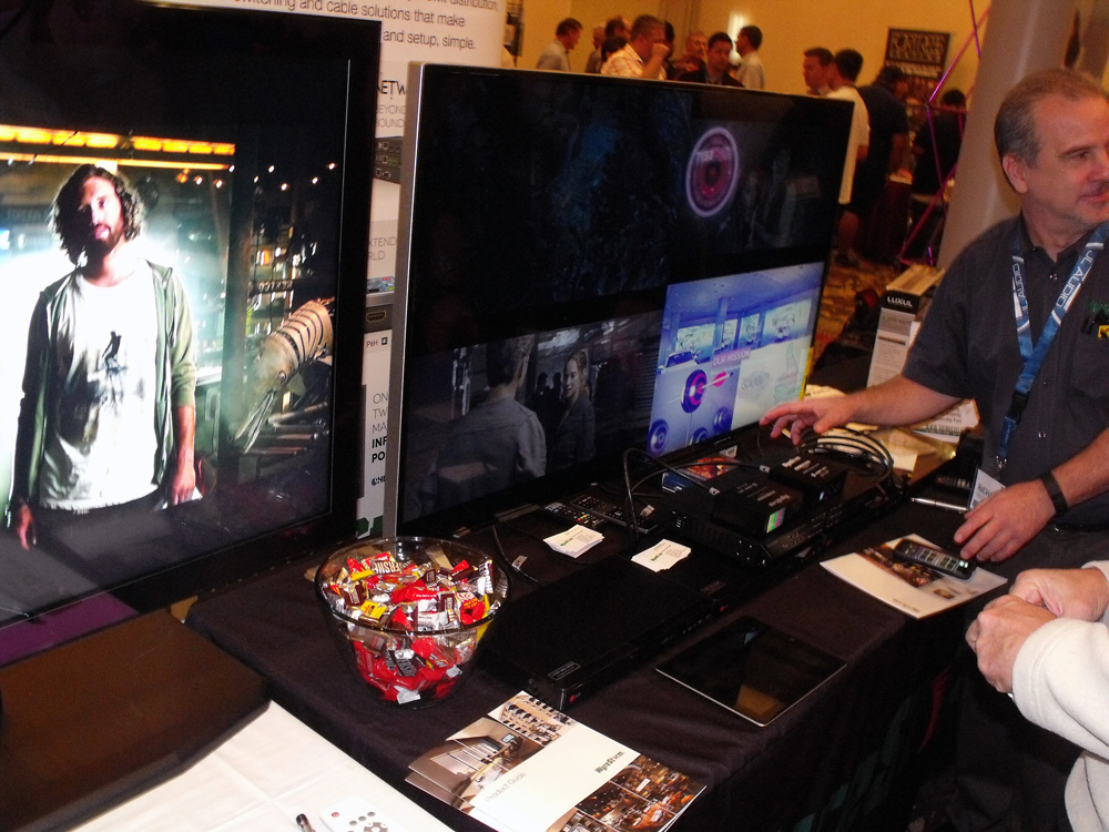 Just across the room was Digital Projection‘s Insight 4K Series with a Stewart fixed tension screen. This is a huge unit. At 12,000 Lumens and 148lbs I could have sworn it was designed for a commercial movie theater. But considering it also sells for $120,000 it obviously is not for the average consumer. They do offer their E-Vision Series projector at a much more affordable $4500.