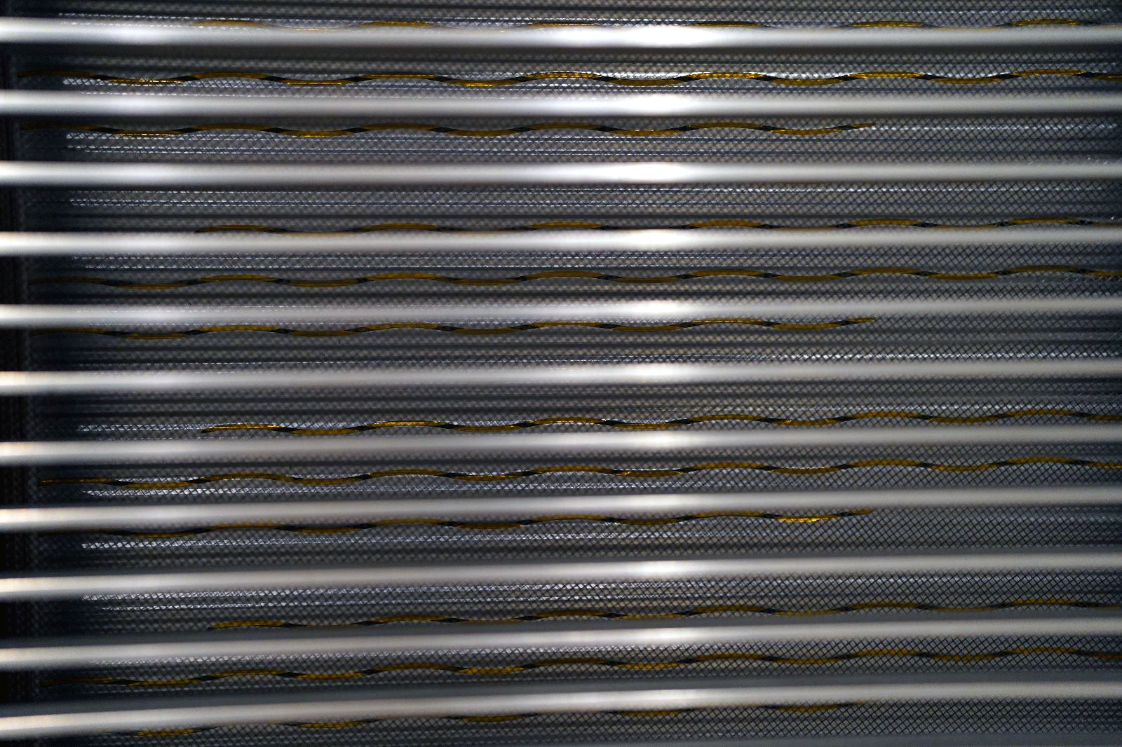 Behind the front lattice work over the mid-bass ribbons is a thin metal mesh, and on the back underneath the transparent fabric is a perforated metal grid quite like the one used for the Sound Lab Ultimate 545 or the King III. With a ribbon speaker the electrical signal is applied to the diaphragm, the ribbon, and it interacts with a magnet array (some dipole speakers sandwich the diaphragm between two magnet arrays). I suspect the perforated metal back is to hold magnet arrays in place near the backside of the mid-bass ribbon driver. See my Interview for the response by Clarisys to this and other technical questions.
