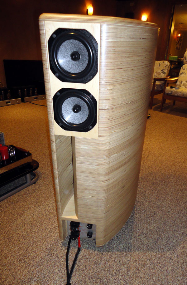 A distinct advantage was gained in the bass response when I determined to place the speakers in an unorthodox position. Seeing as the rear port followed the contour of the cabinet, pointing in the opposite direction from the angle of the front baffle, I determined to switch the left and right speakers to gain more involvement of the side walls from the port. Once switched, the speakers had to be flared outward to a radical degree. This swung the back end of the speaker, and the port, far closer to the side wall. It was visually shocking, as the backward tilt of the speaker combined with the curvature of the cabinet made it appear as though it would topple over at any moment. I checked the stability of the speakers several times to assure myself they were not going to go over if I happened to brush past them. However, once at ease with it the flared position was a refreshing alternative to the mundane straight ahead positioning of countless speakers. If the Strata finish will not elicit surprise from guests, the flared positioning surely will!