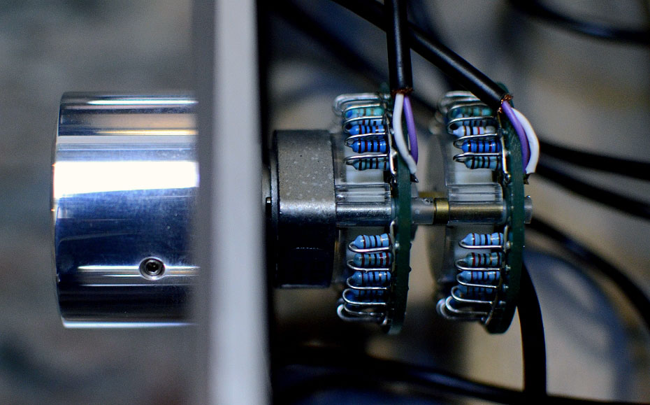 Peeking under the hood, I was pleased to see that all three of the front panel control dials are not made of low quality carbon film potentiometers, but actually high quality 24-step rotary switches made by ELMA, similar to the ones used in the high quality DACT (Danish Audio Connect) stepped attenuators. According to Christoph, rotary switches of the highest quality must be utilized because they carry the signal path; computer grade dip switches are simply unable to achieve the low level of distortion which he demands. Each of the contact points on the ELMA 24-step rotary switch is gold plated and the plating covers 90% of the surface area of the PCB, making it virtually immune to oxidation. Oxidation, said Christoph, is the primary source of signal degradation and must be avoided like the plague.