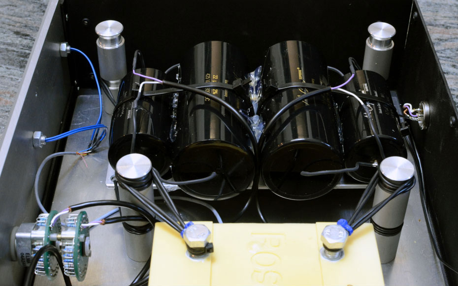 The Canofer-S has no ON/OFF switch on the front panel, it’s instead found on the external power supply unit. The power supply unit houses two vacuum sealed transformer units with separate coils, which reduces cross interference between channels to undetectable levels. Each of the separate power supply units powers two completely separate amplification modules, which are encased in a proprietary polyurethane resin custom designed for Rossner and Sohn by a company called Elalta, which in turn specializes in the development and manufacture of specialized epoxy materials. The resin has been rigorously tested for micro sonic resonance, temperature control, corrosion, as well as vibrational properties. As mentioned before, the entire encasement is suspended in mid-air inside the chassis.