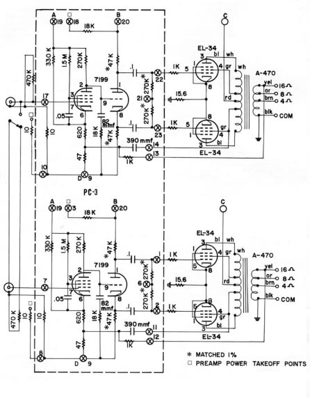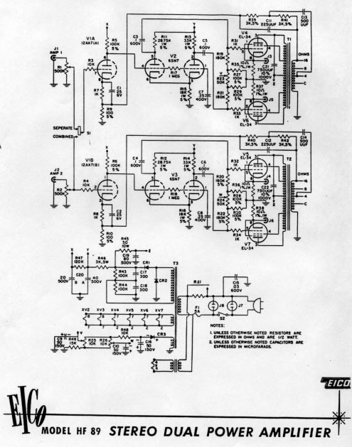 What Dynaco needed for an excellent design was one 12ax7 (or 5751, 6SL7, etc) and two 12au7 (or 6cg7, or 6sn7, etc..). The single 12ax7 is shared. One more tube (three 9-pin tubes, instead of two) is all that was needed for a thorough stereo design. To see how it could’ve and should’ve been done, look at the input and driver circuit of the Eico HF89. Both channels share a single 12ax7. The input of the amp goes to one section of the 12ax7 dual triode, which amplifies the signal, and sends it to the input of the long-tailed pair phase-splitter. The other input of the long-tailed pair is grounded. The HF89 DC-couples the input of the amp to the grid of the 12ax7 input tube, and the output of the 12ax7 is DC-coupled to the input of the long-tailed pair, which is a 6sn7. DC-coupled means there is no coupling capacitor between the active devices. If I have one unchangeable belief in audio, it is this: coupling capacitors suck! Dynaco, to save a few pennies, could’ve used one 12ax7 and two 6cg7 for the same results as the HF89: the 6cg7 is a 9-pin miniature version of the 6sn7, though they do sound somewhat different. The outputs of the long-tailed pair are AC-coupled to the input grids of the EL34. AC-coupled means that the long-tailed pair is capacitor coupled to the output tubes. We finally have coupling capacitors in the signal path, but at least it’s after the signal has been amplified to very high levels, reducing the aural impacts of coupling capacitors. If you look at the schematic of the HF89, and study the classic use of the long-tailed pair, you will notice that the plate load resistors of the two halves of the 6sn7 are slightly different, namely 28.75K and 33K, which was worked out through experimentation. Why? Because there is AC “leakage” through the 18K cathode resistor “feeding” the two cathodes of the 6sn7, where the 18K resistor sets the bias or DC current of the two triodes. Where the AC signal should be pushing back and forth between the two cathodes, some signal slips through the 18K cathode resistor, and leaks to ground. It would be like having a seesaw with a fulcrum point made of rubber, instead of being rigid. To compensate for one side of the circuit being slightly soft, they rebalanced things by changing one plate resistor.